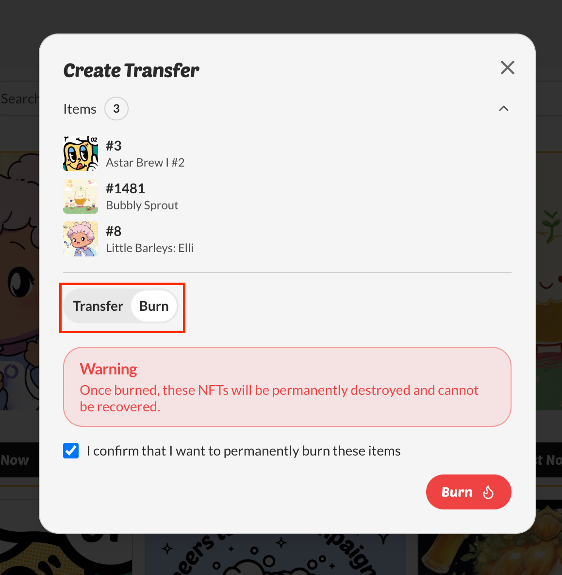 - Confirm the transaction — your NFTs will be permanently burned.