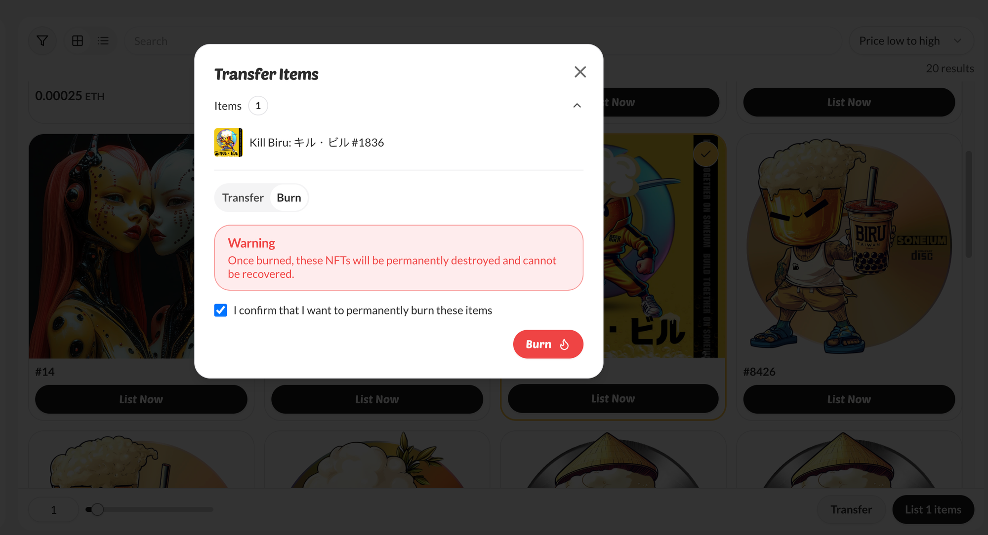 燒毀 5 個以上 Kill Biru NFT,即有機會獲得 25 美元等值 ETH!