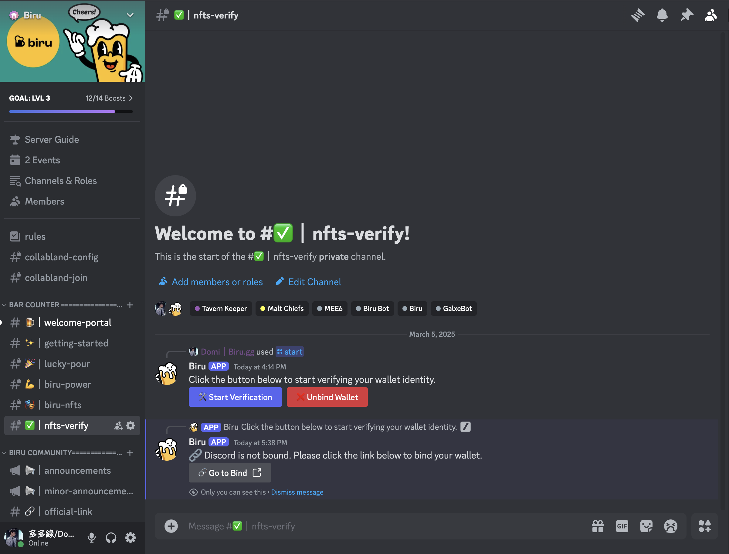 After clicking the verification button, you'll be prompted to click “Go to Bind” to link your wallet to Biru Discord.