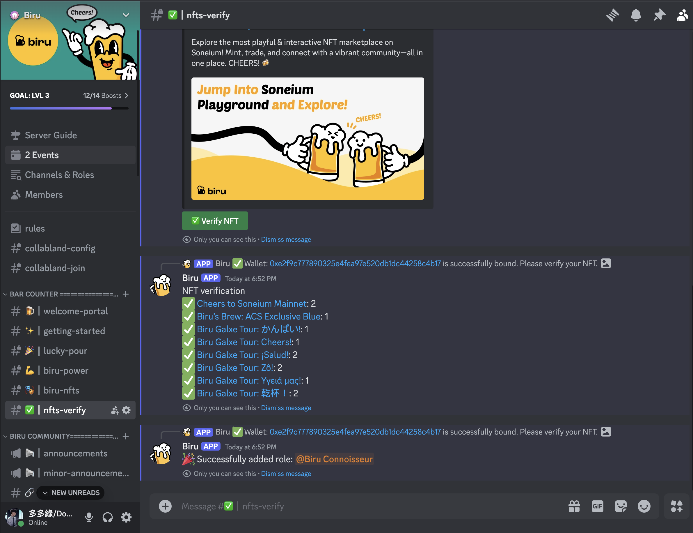 Once your wallet is connected, go back and click the "Start Verification" button again. Then, click the "Verify NFT" button to complete the process. Your role will be automatically assigned in the Biru Discord server based on your verified NFTs.